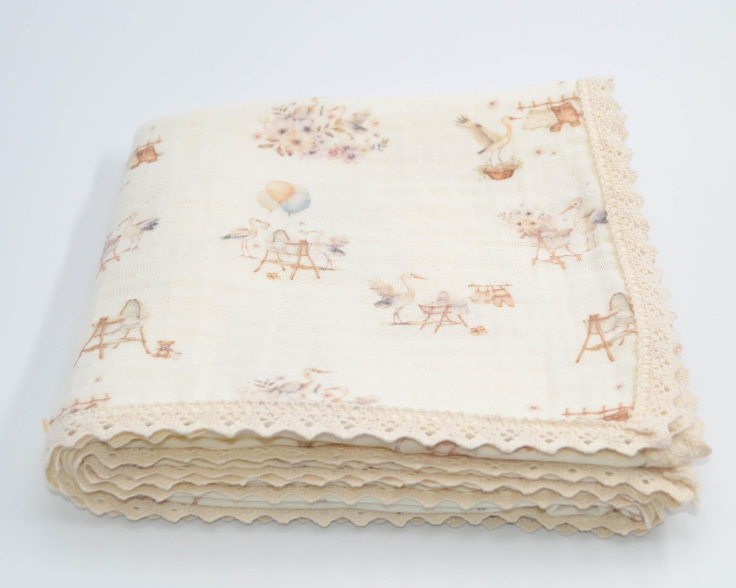 Kenarları Pamuk Dantel ile Detaylandırılmış Dört Kat Desenli Müslin Battaniye