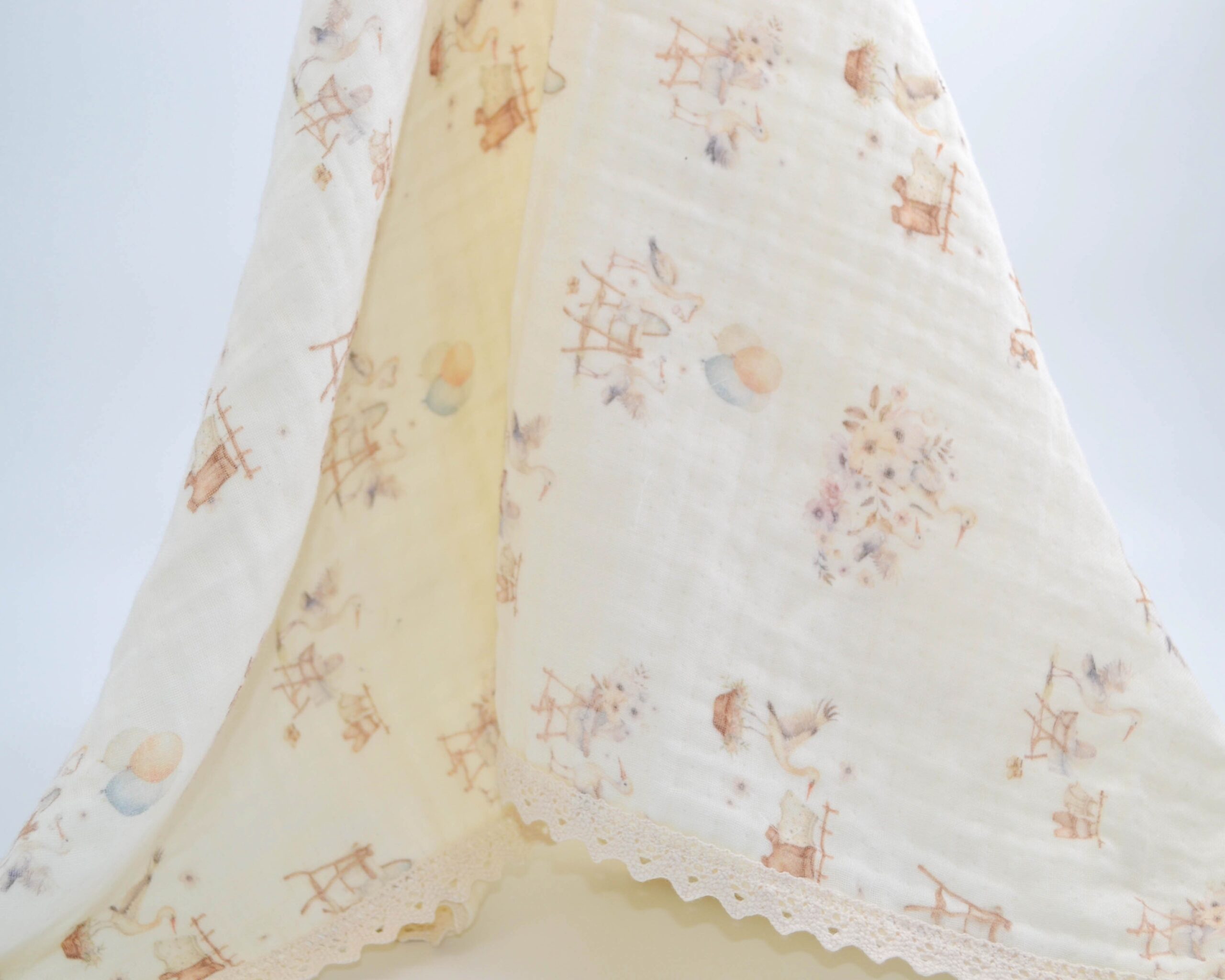 Markamıza özel olarak tasarlanmış leylek ve bebek sepeti desenleriyle masalsı bir atmosfer sunan bu müslin battaniye, yumuşak renk paletiyle vintage bir hava katıyor. Zarif dantel detaylarıyla şıklığı ve konforu bir arada sunuyor.