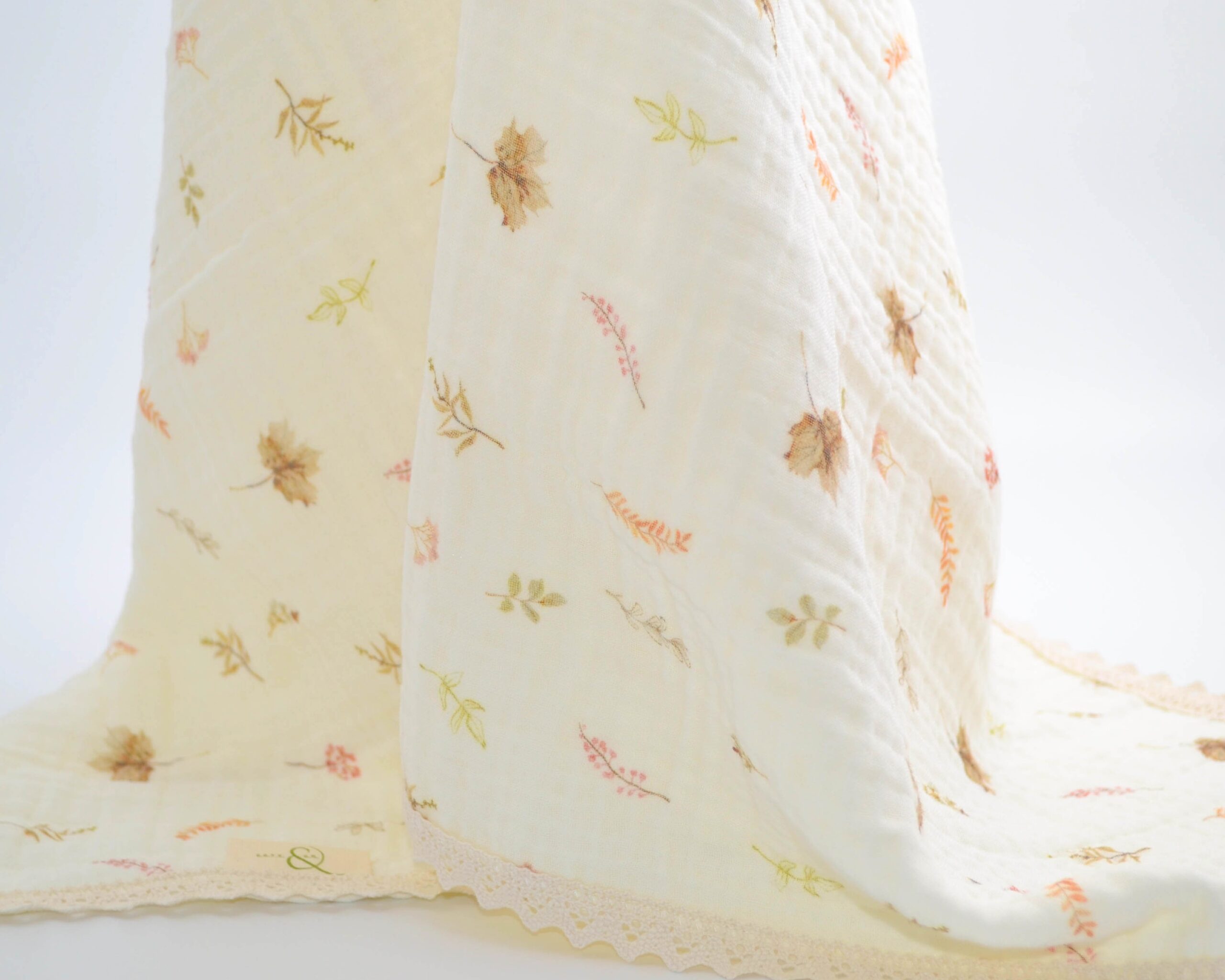 Markamıza özel olarak tasarlanmış, zarif yaprak desenleri ve kenarlarında bulunan pamuk dantel detaylarıyla bu müslin battaniye, doğanın huzurunu evinize taşır. Yumuşak bej tonları ve şık detaylarıyla zarif bir görünüm sunar. Dört katmanlı pamuklu müslin kumaşı ekstra yumuşaklık ve konfor sağlar.