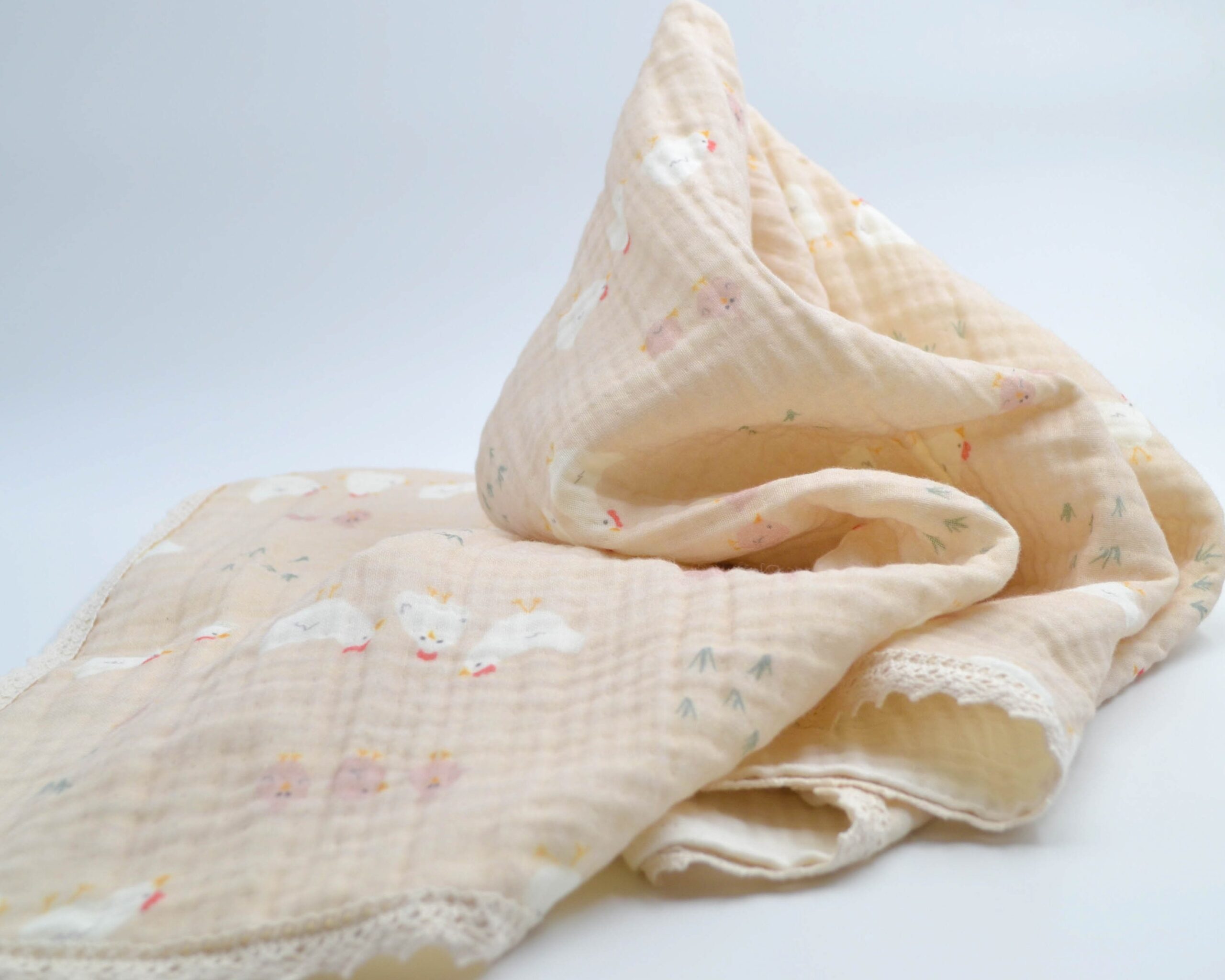 Markamıza özel olarak tasarlanmış desenleri, kenarlarındaki pamuk dantel detaylarıyla birleşerek bu müslin battaniyeye zarif ve sevimli bir görünüm kazandırarak, neşeli bir çiftlik atmosferini andırır. Dört katmanlı pamuklu müslin kumaşıyla ekstra yumuşaklık ve konfor sağlar.”
